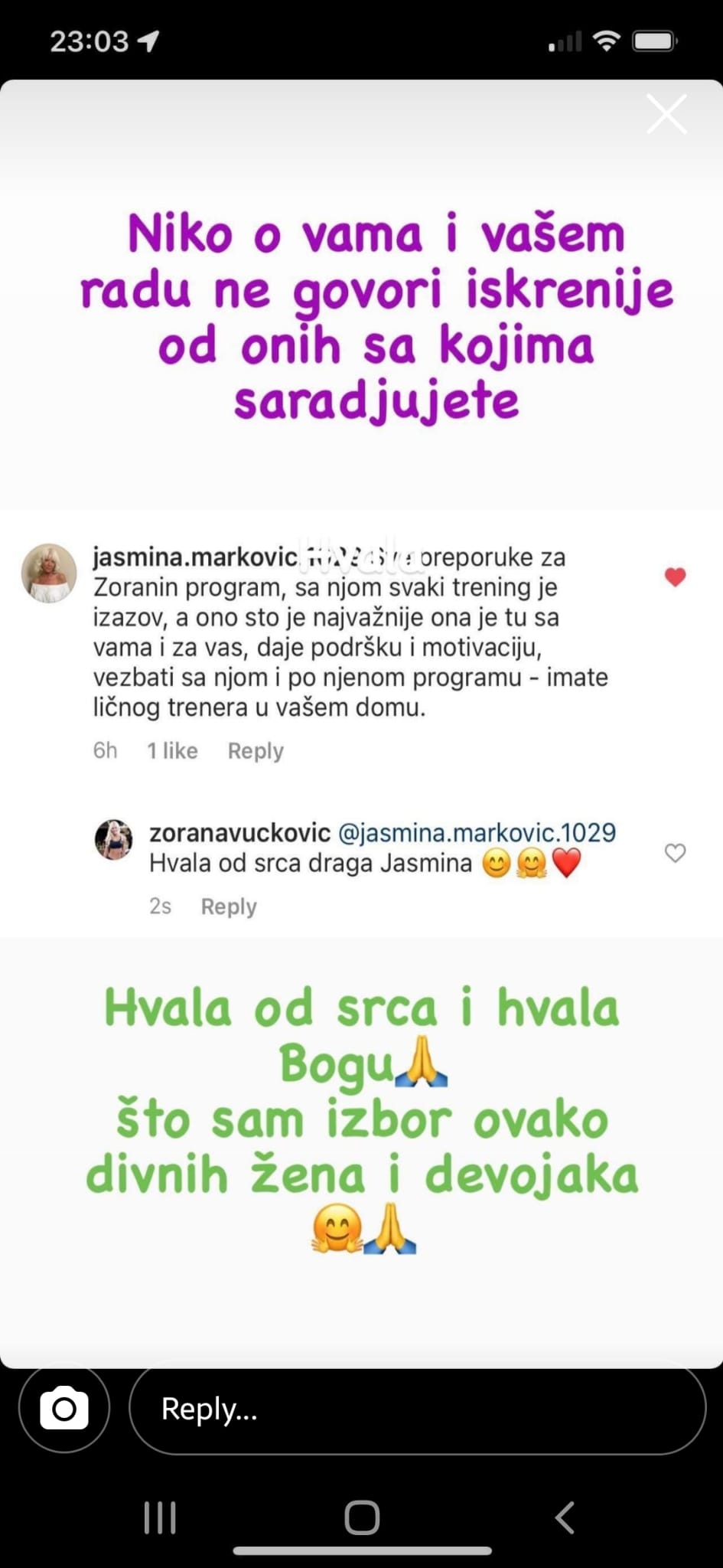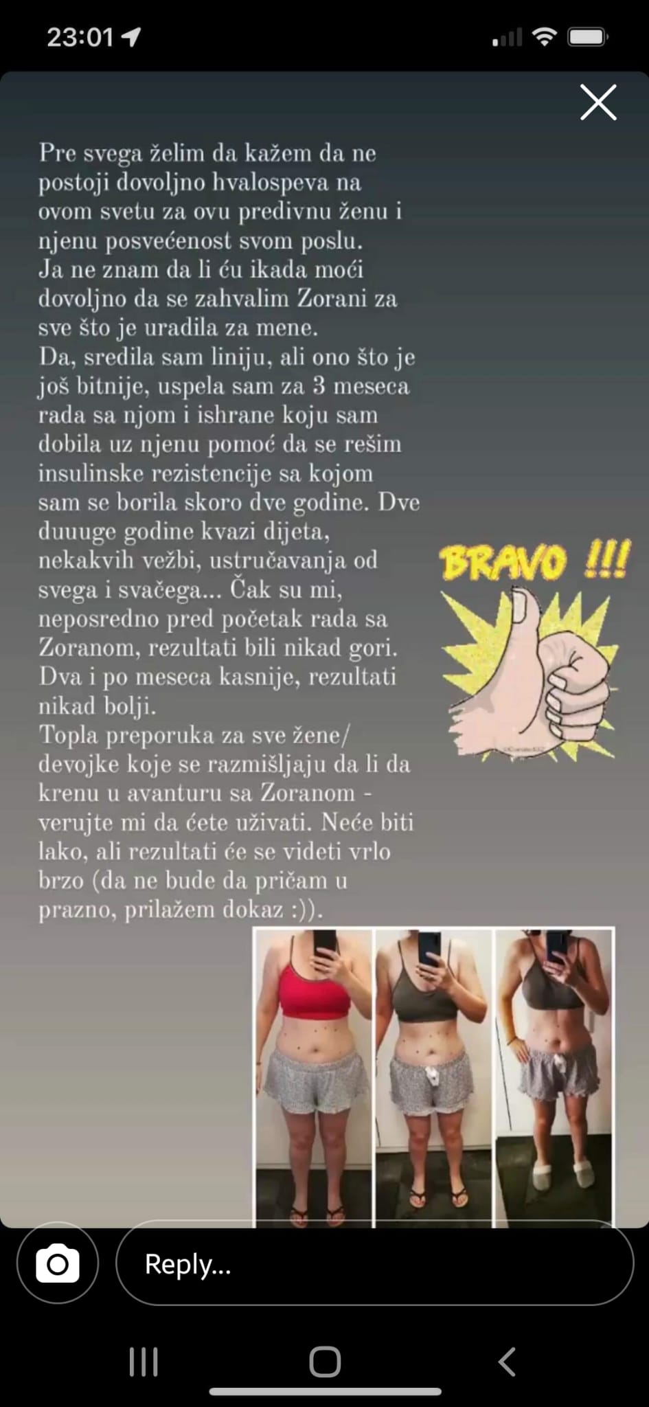 Uz Zoraninu podršku naučila sam prevazići izgovore. Ona me je naučila da budem uporna. Rezultati su mi već vidljivi, puna sam samopouzdanja, a treniram čak i na odmoru!